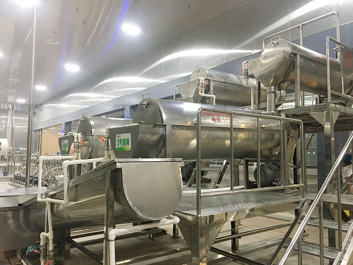 啟動(dòng)園篩后應(yīng)打開(kāi)中心軸噴水閥門,然后將粉碎后的粉漿均勻的送入進(jìn)料口,由螺旋推進(jìn)器等速的送入篩內(nèi),粉漿在螺旋升角為3-5°的旋轉(zhuǎn)毛刷與膠皮刮板的攪拌推動(dòng)下,在篩內(nèi)翻滾前進(jìn),篩網(wǎng)采用無(wú)外支承架結(jié)構(gòu),這樣不僅提高了分離面積,而且還增加了篩網(wǎng)抖動(dòng),改善了分離效果。這種設(shè)備即利于排渣,毛刷又能刷去篩網(wǎng)表面的果膠,使篩分工作連續(xù)進(jìn)行。